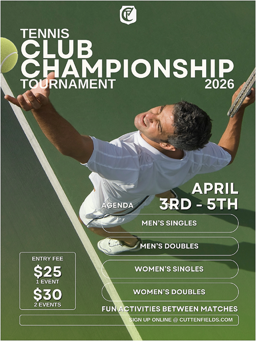 Tennis Club Championship Weekend on Friday April 3 - Sunday April 5th Times TBD.